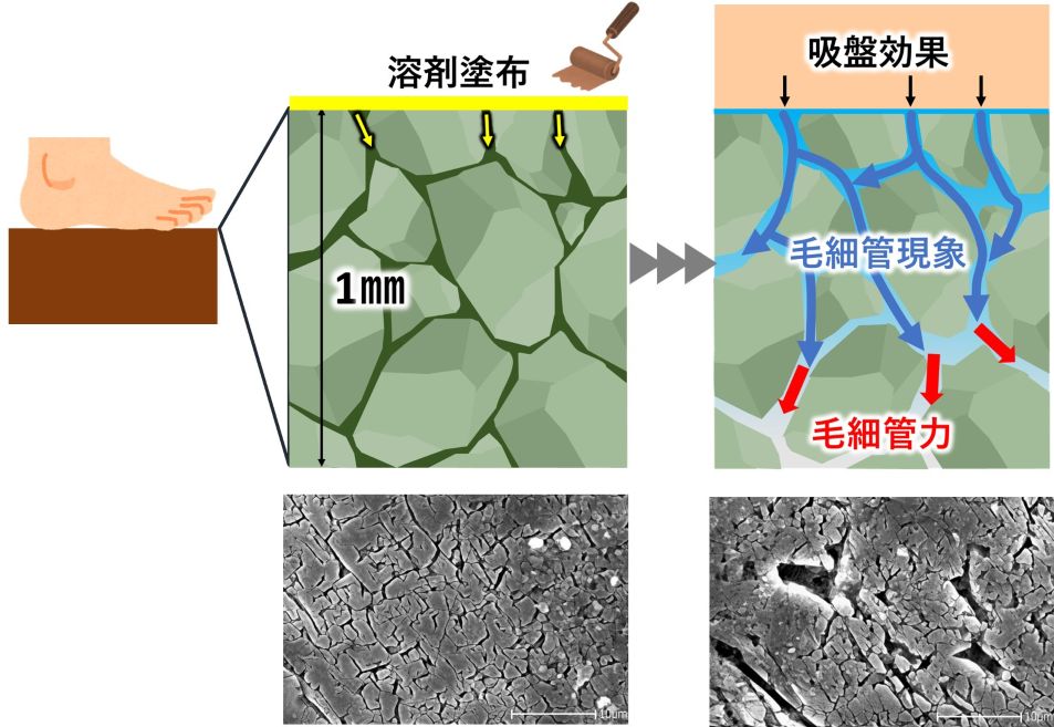 当社のME工法は、各種床材(素材)に応じた完全オーダーメイドのオリジナル溶剤で技術的に適正反応させ、隙間を大きくすることで、滑りを制御します。ME工法で使用する溶剤は、滑り止めに特化し、お客様の環境に合わせ製作する100%オリジナル溶剤を使用しているため、一般に販売している溶剤とは異なります。
